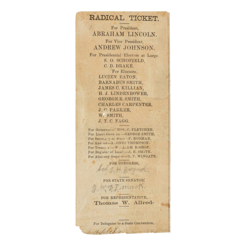 Thanks to this sequence of events, Missouri remained bitterly divided throughout the Civil War, despite remaining officially part of the Union. Anyone who wished to cast a vote in the 1864 election in Missouri was required to take an oath of loyalty to the Union first, a requirement that greatly advantaged the Republican ticket. While Lincoln and Johnson ran on the Union Party ticket, the present ballot is headed "Radical Ticket," likely a pejorative against Lincoln's policies towards slavery.