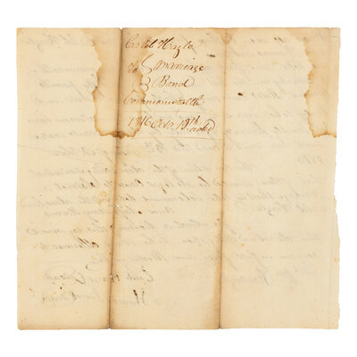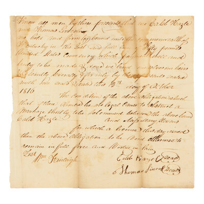 One page, 4to (184 x 210 mm), old folds, staining. Docketed on verso, "Caleb Hazle / Marriage Bond / Commonwealth / 1816 Oct/ 19th."