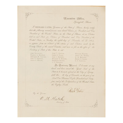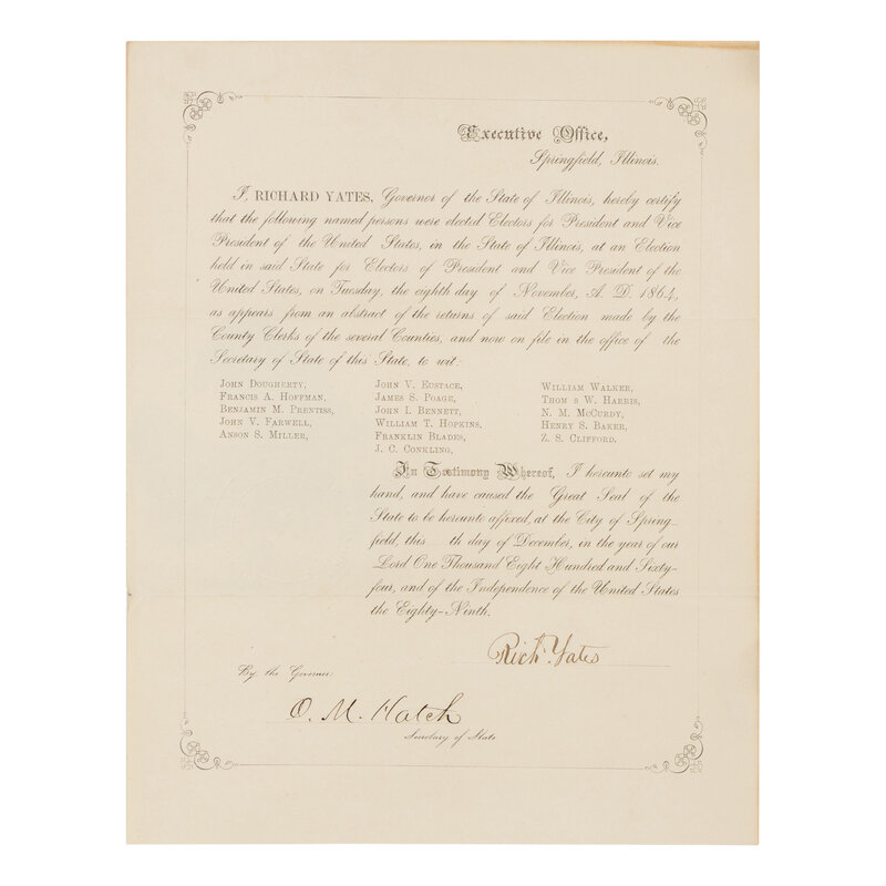 Despite being President Lincoln's home state, the race against McClellan proved to be close, with the president winning 189,512 votes to McClellan's 158,724. That same day, Governor Richard Yates officially appointed the state's electors, among them prominent Republicans such as Francis A. Hoffman, Anson S. Miller, James Cook Conkling, and John V. Farwell. The present document, dated 8 November 1864, bears the official seal of the State of Illinois.