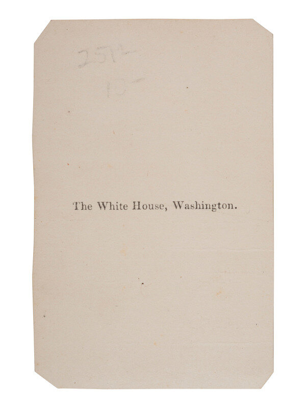 2 1/4 3 1/2 in. albumen print including margins, affixed to cardstock mount with printed caption on verso, "The White House, Washington." Attributed to Henry F. Warren, the photograph shows the North Portico of the White House. The young man in the foreground is thought to be Abraham Lincoln's son, Tad. Another example of this photograph is held by the White House Historical Association.