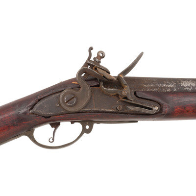 .76 caliber. 42.5" pinned barrel. NSN. Bright finish brass furniture, hardwood stock. Single shot muzzleloading reconverted flintlock musket assembled from parts. Germanic or Low Countries style flat faceted banana shaped lock is unmarked and reconverted to flint with an added pan, frizzen, cock and external parts. Barrel is engraved DOVGLAS (Douglas) on the top, and while the engraving is old, it may not be contemporary to the manufacture of the barrel. Barrel also of Germanic or Low Countries style with a low 1" long brass blade front sight about 3.5" from the muzzle and the indication that a socket bayonet lug was located about 1" from the muzzle under the barrel, but is now missing. Touchhole does not align well with the pan. Brass components are similarly Low Countries in styling. Parts are assembled into a stretched stock that may be of cherry from the entry pipe back, with the forend a spliced addition of more recent vintage. Metal parts are somewhat ill-fitted to the wood, no side plate is employed and the stock shows some repairs in addition to the spliced forend. It not clear if this is a restoration of an old, period of use American restock of salvaged gun parts, or if the combination of the parts took place in a more recent era. Includes an old iron button head ramrod. {ANTIQUE}