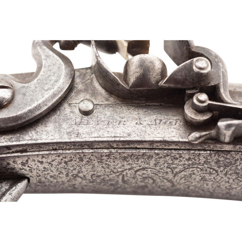 .40 caliber. 5" round three-stage slightly swamped barrel with baluster turned rings at the transitions. NSN. Bright steel finish, all metal construction. Single shot flintlock muzzleloading pistol of traditional Scottish "Scroll Butt" form, with no sights, vent pick in butt, belt hook on reverse and functional steel ramrod. Lock appears to be marked MEYER & ?, possibly Meyer & Quiller of Edinburgh, who worked circa 1770-1800. Lock with waterproof bridled and fenced pan and roller frizzen. Metal with light scroll engraving, mostly obscured by oxidation and pitting. {ANTIQUE}