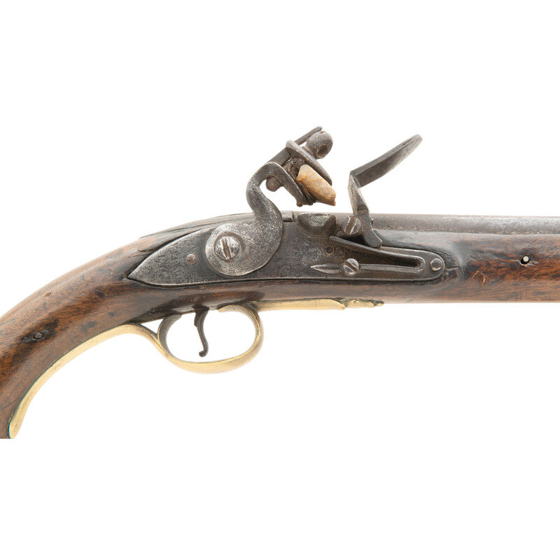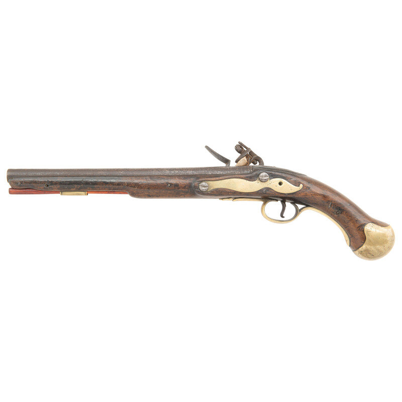 .58 caliber. 11.875" pinned round barrel. NSN. Heavily oxidized metal, brass furniture, walnut stock. Single shot muzzleloading smoothbore pistol, missing the belt hook, with no sights and a replacement wooden ramrod. 1756 pattern long sear spring lock is marked VERNON/1762 at the tail with an integral faceted iron pan without fence or external bridle, replaced swan neck cock of incorrect form and spear tip steel spring finial. Lock appears to be in original flint configuration with some replaced parts, in particular the cock. {ANTIQUE}
