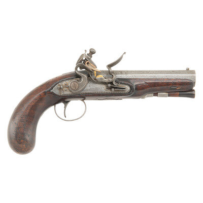 .54 Cal. 4.625" barrel length. SN: NSN. Bright metal finish with walnut stock mounting iron fittings, silver oval plate, and octagonal barrel. Single shot flintlock pistol with gold touch hole, roller frizzen, waterproof pan, and safety lock behind cock. Stock retained by a single wedge pin. Triggerguard features a pineapple finial, and both the hammer and lockplate are engraved with wheat chaff border scroll, and foliate details on cock. Lockplate signed JOVER JUNr. Upper barrel marked JOVER JUNR NEW BOND STREET LONDON. London proofs struck into the bottom of the barrel below chamber. Oval plate is engraved with the initials RJ. Comes with horn tipped wood ramrod. {ANTIQUE}