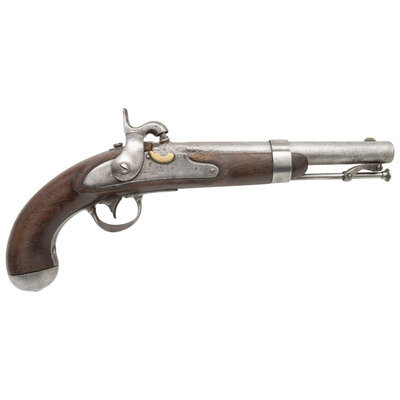 .58 Cal. 8.5" barrel length. SN: NSN. Finished in the white mounting walnut stock, iron fittings, brass bolster, and swivel ramrod. Single shot percussion conversion pistol of an 1836 Waters pistol. Lockplate is marked {Eaglehead}/A.H. WATERS & Co./MILBURY MASS/1844 followed by T initial. Item shows H initials to backstrap, serpentine, and barrel band. Counterpane shows circled JH mark of Joseph Hannis, WAT mark for William Anderson Thornton, and the initials R.H.W., which appear to have been scratched in by a previous owner. Screw for ramrod swivel has been replaced with a roughly cut modern example. {ANTIQUE}