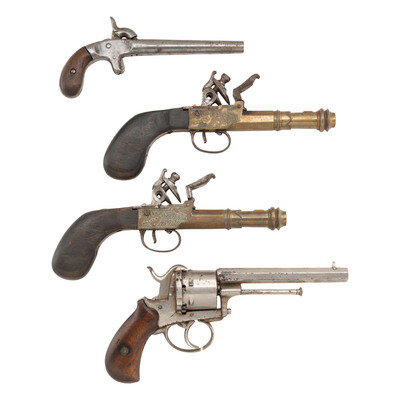 Lot of Four Antique Pistols including: .31 Cal. Single Shot percussion pistol, two modern production display purpose brass barrel flintlock boxlock pistols marked WALTER, and a 9mm Pinfire Belgian revolver following Lefaucheux's 1858 double action patent. {ANTIQUE}
