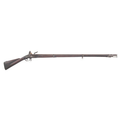 .72 caliber. 44.5" barrel. NSN. Bright finish, iron furniture, walnut stock. Single shot reconverted composite flintlock musket with no sights, a small socket bayonet lug on top of the barrel about .65" from the muzzle, sling swivels, with the lower swivel being a ring and a reproduction ramrod. Reconverted flint lock with no legible markings except a non-conjoined "US" at the tail, suggesting post-Revolutionary War ownership by the US government. The gun appears to be one of the thousands of restocked and rebuilt US guns that were assembled from parts in the decade following the American Revolution. The stock is very much of a French form with a pronounced rail and curving "French Butt" similar to those found on US arsenal guns circa 1790s-early 1800s. The barrel appears to be from a French musket with a replaced tang and is retained by three flat iron bands that are not secured by springs, the upper secured with a screw, the middle with a pin and the lower by friction. The lock is reconverted with an incorrect cock. Lock is somewhat ill fitting with wood loss around the rear edges of the mortise. An interesting old composite musket with a Federal Era US surcharge on the lock. {ANTIQUE}