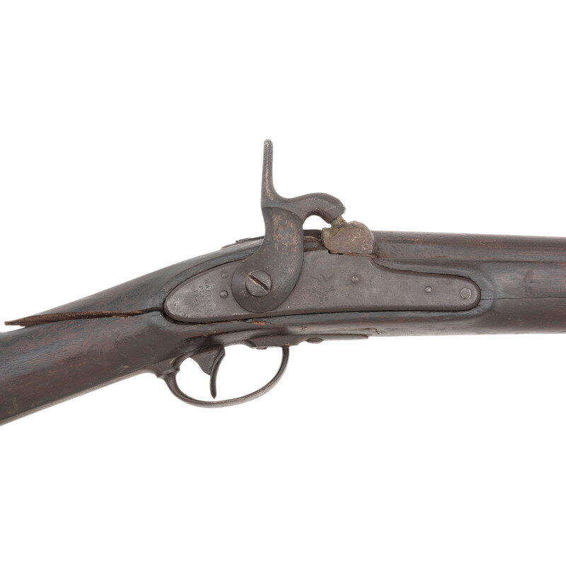 .69 caliber. 37" barrel. NSN. Heavily oxidized metal, iron furniture, walnut stock. Single shot percussion muzzleloading musket shortened to shotgun with shortened stock, missing the middle band and sling swivels and with an added incorrect ramrod. Harpers Ferry marked lock dated 1846. No other visible markings, including proofs. {ANTIQUE}