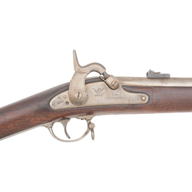 .58 caliber. 40" round barrel secured by three flat, spring-retained barrel bands. NSN. Bright finish, iron furniture, walnut stock. Single shot percussion muzzleloading rifle musket with a reproduction M1861 pattern three leaf rear sight, Barleycorn combination front sight and socket bayonet lug, sling swivels and a swelled-shank tulip head ramrod. Lock marked with a {Spread-Winged Eagle}/U.S. forward of the hammer and in two horizontal lines U.S./SPRINGFIELD and dated 1862 at the tail. Breech and barrel with no visible markings. No cartouches on counterpane with a spliced wood repair. {ANTIQUE}
