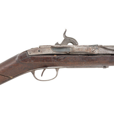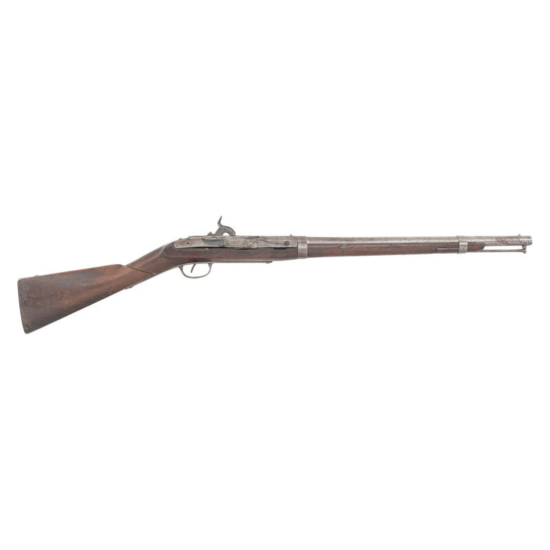 .52 caliber smoothbore. 21" barrel. NSN. Browned finish, color casehardened breech block and hammer, iron furniture, walnut stock secured by two flat, pinned barrel bands. Single shot percussion breechloading carbine with side lever to operate breech, fixed notch rear sight, fixed front sight blade, 8.5" sling bar and ring and an old replacement button head cleaning and clearing rod. No markings present on the top of the breech block, weak traces of cartouches on the rear edges of the stock flats. {ANTIQUE}