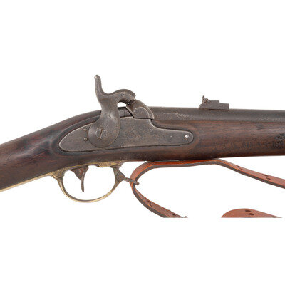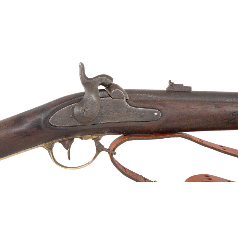 .59 caliber. 33" barrel. NSN. Blued finish, brass furniture, walnut stock. Single shot percussion muzzleloading rifle with M1858/61 hybrid rear sight, M1855 rifle front sight, saber bayonet lug, brass patchbox, sling swivels and tulip head iron ramrod. Standard markings on lock, markings mostly obliterated by pitting on the barrel. Traces of a cartouche on the flat. Includes an incorrect pattern reproduction sling. {ANTIQUE}