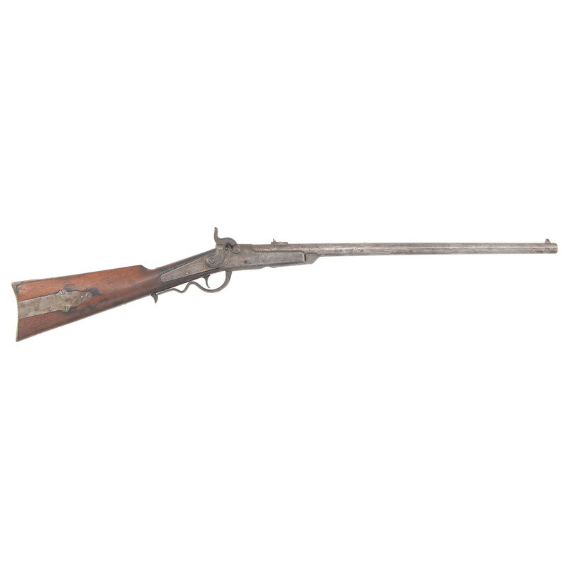 .50 caliber. 22.125" barrel. SN: 15870. No finish, iron furniture, walnut stock. Single shot percussion breechloading carbine with iron patchbox, military leaf rear sight, fixed front sight and saddle bar with ring. Standard Gallager markings, no visible cartouches. {ANTIQUE}