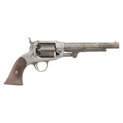 .44 Cal. 7.5" barrel length. SN: 5407. Blued metal finish cleaned to bright with walnut two-piece grips mounting conical brass front blade and dovetailed rear notch sights. Single action six-shot percussion revolver with solid frame and octagonal barrel. Topstrap is marked ROGERS & SPENCER/UTICA NY. Item shows a {Shield} proof to lower frame, and C initial to the barrel after the serial number and mating number, the latter being 2709. P initial to right barrel, but no extant cartouches on grips. Serial numbers match on the barrel, butt and left frame, but the cylinder shows a non matching number of 5410. Replaced loading lever stud, and likely replaced front sight. {ANTIQUE}