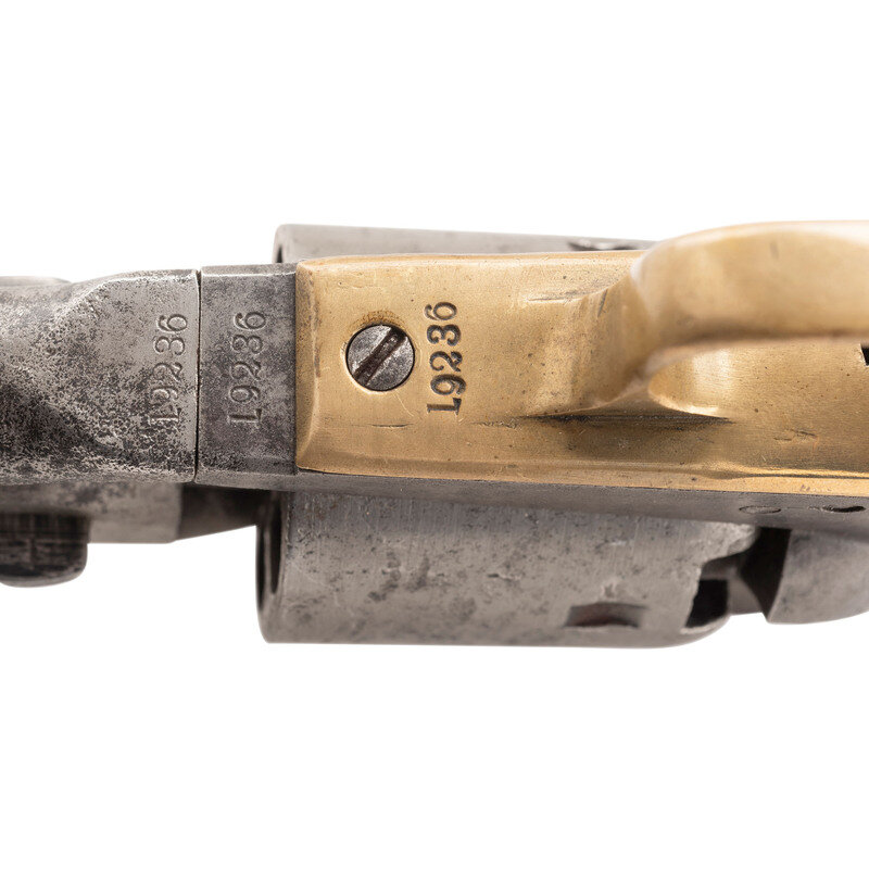 .36 caliber. 7.5" round barrel. SN: 19236 (mfg. ca. 1864). No finish, brass backstrap and triggerguard, one piece smooth walnut grip. Single action percussion revolver with unfluted six-chambered cylinder, hammer nose notch rear sight, German silver blade front sight and creeping loading lever. Weak one-line New-York U.S.A. barrel address, weak two-line frame patent mark. Visible numbers match, cylinder likely renumbered, wedge mismatched, arbor matching. Revolver is accompanied by a more recent tooled leather flap holster missing the closure button. {ANTIQUE}