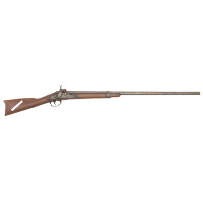 .69 caliber. 35.25" barrel. NSN. Bright finish, iron furniture, walnut stock. Single shot "cone in barrel" percussion alteration of US M1822 flintlock musket altered to shotgun with a shortened stock and barrel, with only the lower barrel band retained. Standard Springfield markings on lock, dated 1824 at tail. Barrel markings largely obliterated by pitting and wear. No ramrod present. {ANTIQUE}