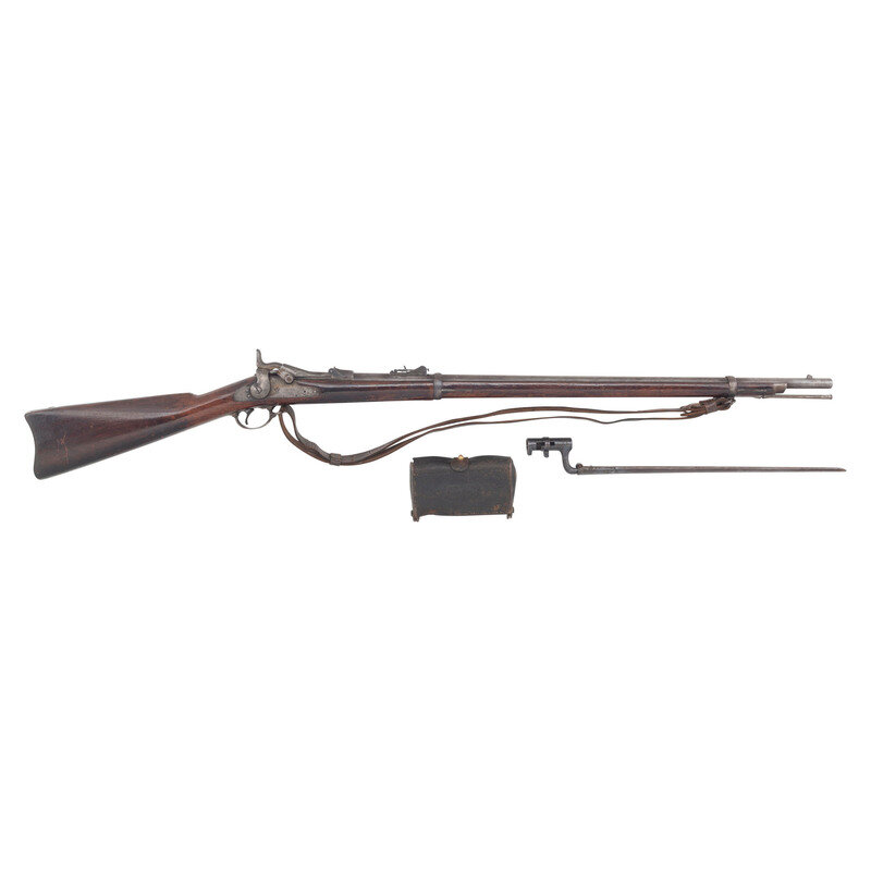 .45-70. 32.375" barrel. SN: 78212. Blued and color casehardened finish, iron furniture, walnut stock. Single shot breechloading military rifle with M1879 pattern rear sight, Barleycorn front sight, sling and stacking swivels and cleaning rod. Standard markings in metal. Wood markings mostly obscured by an old refinish. Rifle is equipped with a US M1887 sling and includes an M1873 bayonet with scabbard but no frog and a McKeever cartridge box. {ANTIQUE}
