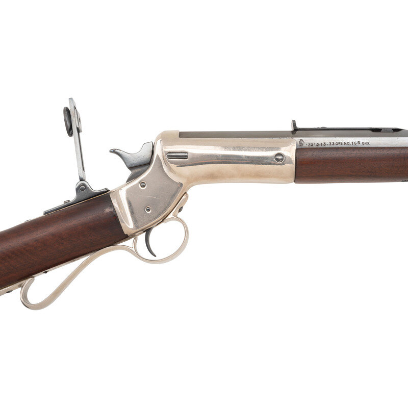 .32 caliber (probably .32-40 but a chamber casting is recommended). 27.875" octagonal barrel. SN: 32371. Blued finish, nickel plated receiver, triggerguard and buttplate, straight grip walnut stock with Swiss buttplate, walnut Schnabel forend. Single shot tip up rifle with vernier tang sight, barrel mounted semi-buckhorn sight and folding blade and globe front sight. Standard Stevens barrel markings. Right barrel flat is marked with loading information for the cartridge that suggests the chambering is .32-40. Barrel and lower receiver tang with matching serial numbers. Rifle has been professionally restored. {ANTIQUE}