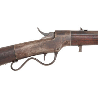 .56-56 Spencer Rimfire. 22" octagonal barrel. SN: 328. Blued finish, iron furniture, walnut stock and forend. Single shot dropping block carbine with L-leaf rear sight, fixed front sight, manual extractor and sling swivels. Weak Ballard Patent and Merwin & Bray markings on frame. No visible markings in wood. {ANTIQUE}