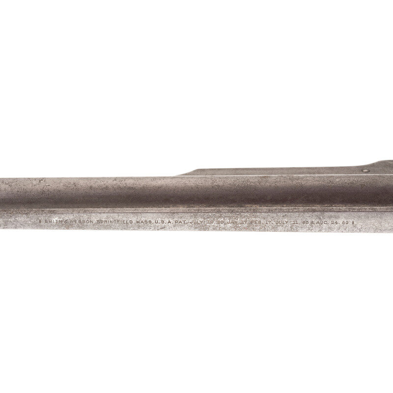 .44 S&W American. 8" ribbed barrel. SN: 8958. No finish, old bone grips. Single action break open simultaneous extraction revolver with notch rear sight in barrel catch and pinned half-moon front sight. Standard S&W barrel markings. Assembly numbers on frame, rear face of cylinder and barrel catch are all mismatched. Grips are ill-fitting and secured with a modern machine screw.