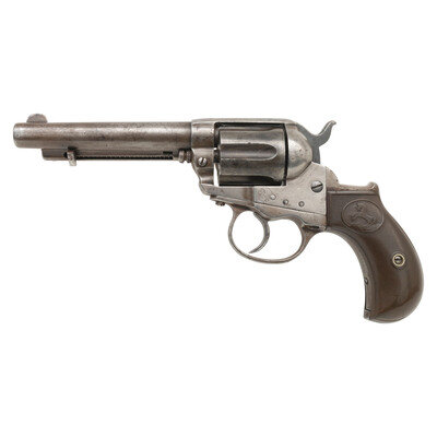 .38 Long Colt. 4.5" barrel length. SN: 84704. (Mfg. ca 1891) Blued and casehardened finish with checkered hardrubber Rampant Colt logo birdshead grips. Double action six-shot loading gate revolver with fixed front blade and topstrap rear notch sights. Top of the barrel is polished down with two-line address that is no longer legible. Circled {Rampant Colt} logo to left frame. Ejector rod head has been replaced with a simple cross hatch cut into it from the front. Firing pin replaced. {ANTIQUE}