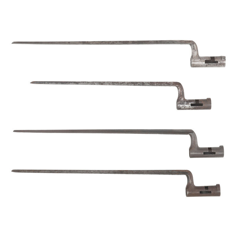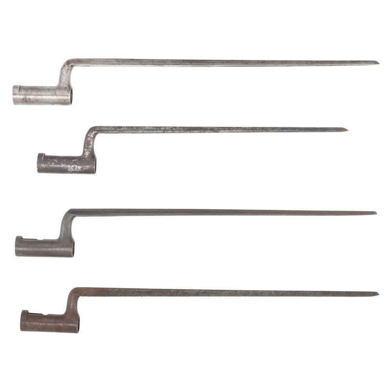2) US Model 1816 Socket Bayonet. 16" fluted blade, 3" friction fit socket with T-mortise, 19" overall. Blade marked US. Obverse of shank rack marked P/46 upside down. Metal evenly oxidized with some surface roughness.
