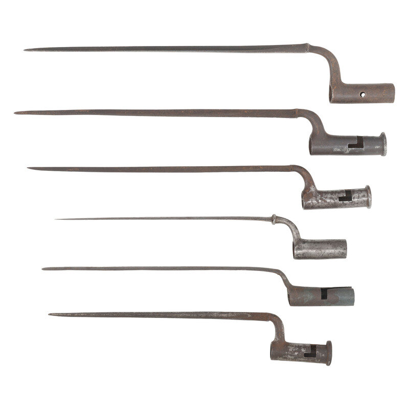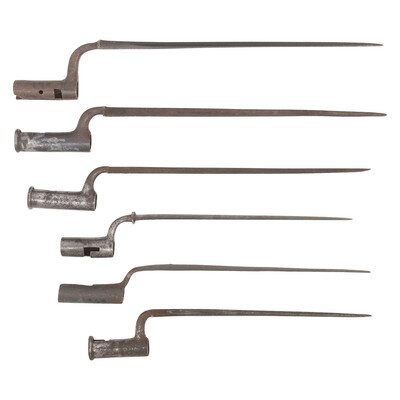 3) Early, crude and heavy socket bayonet, circa mid to late 18th century. 16" unfluted blade, 3.25" unbridged friction fit socket, flat sided shank, 19.5" overall. Socket with holes for tension screws to secure the bayonet more tightly to a barrel. Socket chipped at rear. Near relic condition.