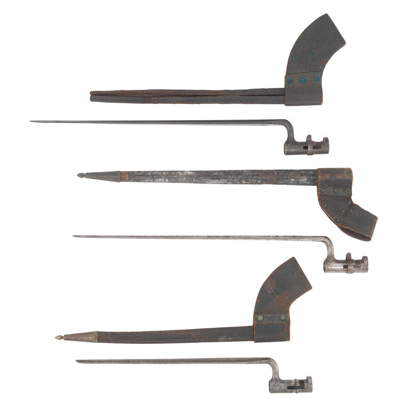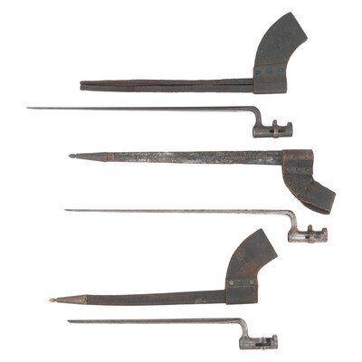 3) US Model 1855 Socket Bayonet in Pattern July of 1864 (8 Rivet) scabbard. 18" blade, 3" socket, 21" overall. Marked US on blade. Locking ring intact. Bayonet blued, possibly for Indian War service on the various .50-70 arms in sue circa 1866 to 1873, as it fits very tightly on a .58 musket and will not fully seat, suggesting it was on that was cold swaged down after the Civil War for Indian War use. Metal moderately oxidized with some pitting. Scabbard well worn.