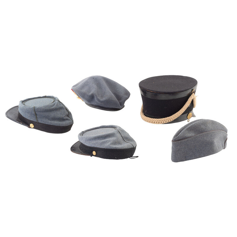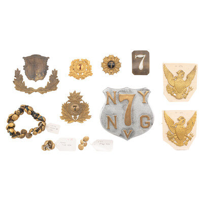 Lot comprised of a selection of hats, devices, epaulettes, buttons, and more, most identified to the 7th New York State Militia. Highlighted items include: