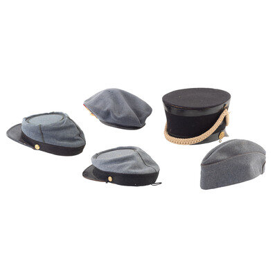 New York State Militia shako having the 7th Regiment emblem, a "Ridabock & Co., New York" manufacturer's label inside hat. Ca 1890. -- Two (2) 7th New York National Guard kepis, each with 2 brass "National Guard" or "NG" buttons. The first with "7" insignia on front, unmarked. The second lacking "7" insignia, with "H. Vallien & Co., New York" manufacturer's label inside hat. Ca last quarter 19th century. -- Dress hat for the 7th New York, "7" insignia on hat, with "Ridabock & Co., New York" manufacturer's label and owner's name written on stitched label inside hat. Ca 1940s. -- Beret for the 7th New York State Regiment with "7" regimental flaming bomb insignia, unmarked. Possibly Korean War or Vietnam era. -- 4 epaulettes, three of which have a single button. -- 8 hat badges or plates, most representing the 7th New York. Most include a "7" at center, and measure approx. 7 x 7 in. or smaller. -- 30+ buttons identified to the 7th New York State Militia or 7th New York National Guard.