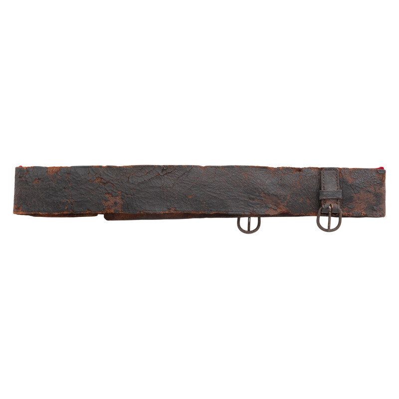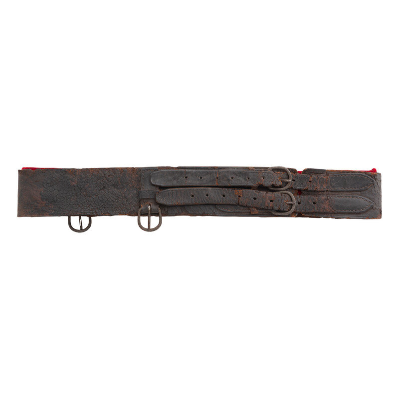 Nominally 38" in length and 1.6" wide. Brown finished bridle leather with a brass buckle, one sewn-on sword hanger, two iron suspensions rings, a crude brass scabbard retention hook and a second hanger attached to the lower ring. The style of the hardware is similar to some English imported cavalry belt rigs used in the south during the Civil War. Possibly locally assembled using a variety of sources for the hardware. Sword hangers with somewhat crudely cast brass snap hook attachments. One snap hook is broken. A nice looking belt that would be perfect for a Confederate cavalry display.