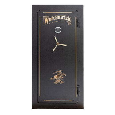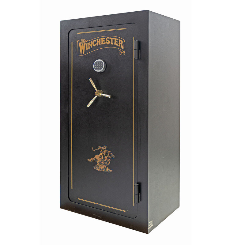 Black gun safe nominally 60" tall, 30" wide and 22" deep with a digital key pad lock. Currently on a pallet. See photos for internal configuration.