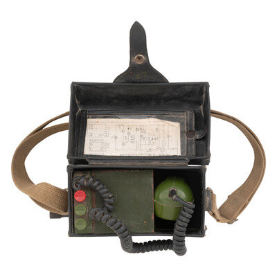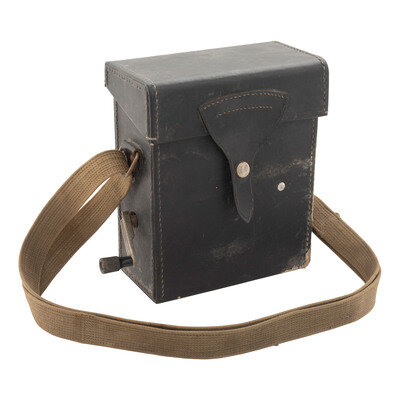 9" x 7.5" x 4.25" Imitation leather case with canvas carrying strap containing a green painted and plastic battery housing and magneto, with removable hand crank to the side. Most likely a Type 65 field phone of the type provided to North Vietnam during the Vietnam War.