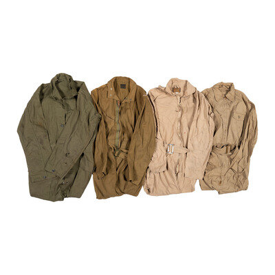 Lot includes three flight suits: Khaki cotton flying suit with label to interior left breast reading SUIT, SUMMER, FLYING/AN 6550-M-36 made by the E.B. MYERS COMPANY; green wool Type A-4 flying suit with label reading TYPE A-4/DWG. NO. 30-732/A.C. ORDER NO./W 535 AC-20685; A size 38 khaki cotton suit with label reading SUITS, FLYING, SUMMER/BU. AERO.-U.S. NAVY/Specification M-426/SIGMUND EISNER CO./Contract No. NOs-88861; and one set green HBT coveralls in size 36R with black painted steel buttons.