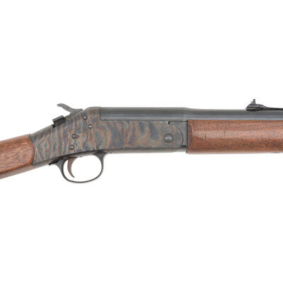 .45 Cal. 28" barrel length. SN: AJ288279. Blued and casehardened finish with walnut straight wrist stock, half length handguard, and black synthetic buttplate. Single shot percussion muzzle loading rifle mounting adjustable semi-buckhorn rear and front blade sights. Comes with a wood and brass ramrod. Standard make and model markings. {ANTIQUE}