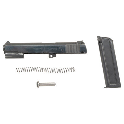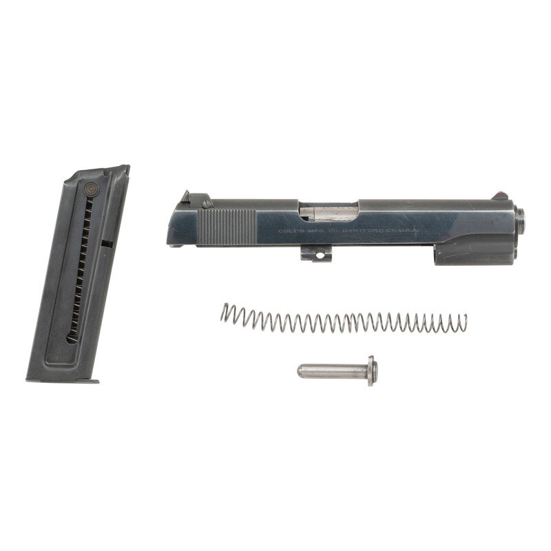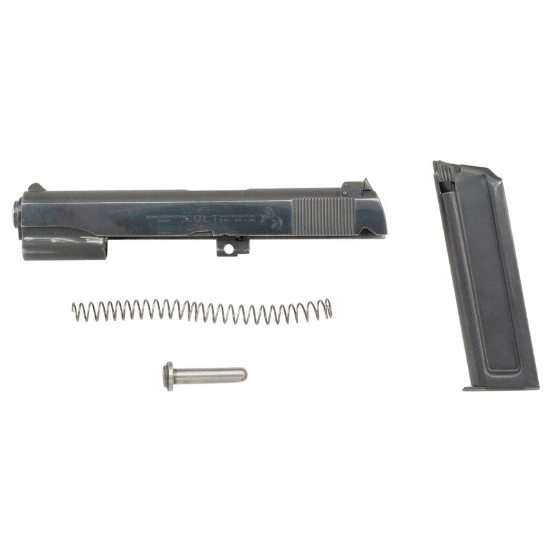 .22 LR. 5" barrel length. SN: NSN. Blued metal finish with polished flats and matte rounds featuring bright polished chamber. .22 Caliber conversion unit for Colt 1911 pistols featuring the two-piece barrel assembly and mounting adjustable target rear notch and front blade sights. Left slide struck CONVERSION/UNIT followed by COLT AUTOMATIC/CAL. .22 L.R. {Rampant Colt}. Right slide marked in a single line COLT'S MFG. CO. HARTFORD CT. U.S.A. Comes with two-piece barrel, recoil spring, bushing, ejector, recoil spring guide, and COLT marked detachable box magazine.
