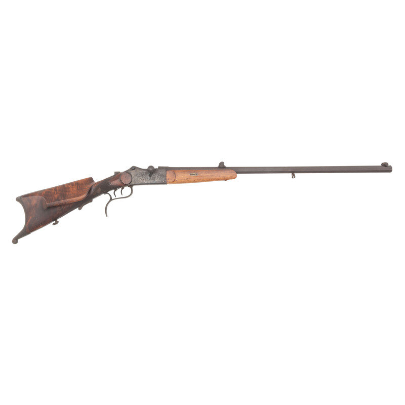 Unknown chambering, nominally 9mm bore. 30" octagonal barrel. No serial number. Blued and color casehardened finish, figured European hardwood stock with checkered wrist, left side cheek rest and Swiss style buttplate. Single shot Martini type action with Swiss sight base missing ladder, front sign blade with protective ears, extended triggerguard, double set triggers and sling swivels. Barrel marked in silver letters PFAU & FRIEBE in MUHLHAUSEN with the left side of the receiver marked in two lines SYSTEM FRIEBE/PATENT No. 13840. Receiver engraved with some tight banknote scrolls. Apparently based upon Friebe & Pfau's 1881 patent for improvements in breechloading firearms. {C&R}
