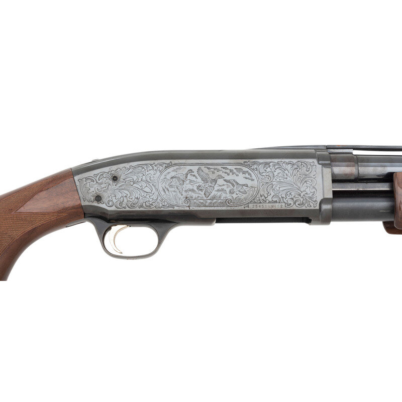 12 Gauge. 28" ribbed barrel. SN: 2545INV157. Blued finish, checkered pistol gripped stock with rubber recoil pad and checkered forend. 3" chamber, 14.125" length of pull, 1.625" drop at comb and 2" drop at heel. Slide action tubular magazine repeating shotgun with gold plated trigger and steel bead front sight. Engraved receiver. Made in Japan for Browning Arms. {MODERN}