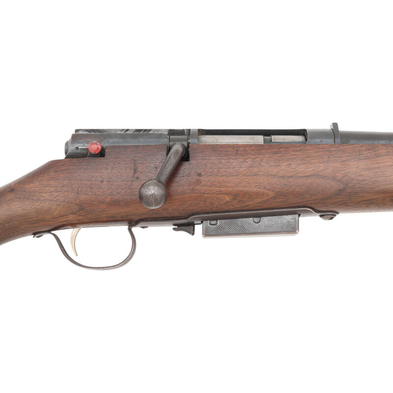 12 Gauge. 31" barrel length. SN: NSN. Choke Reads 16 Gauge Cylinder. 3" chamber length. Blued finish with polished bolt in walnut semi-pistol grip stock mounting fixed rear notch and front bead sights. Bolt action detachable box magazine fed repeating shotgun. Item mounts a slip-on Upland Game recoil pad. Safety knob and front sight bead have been painted with red enamel. {C&R}