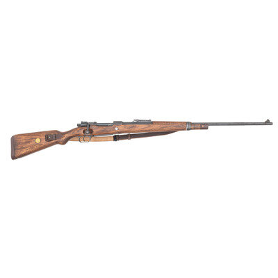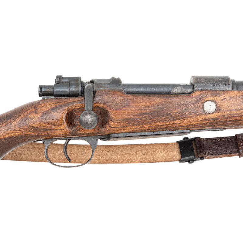 8mm Mauser. 30" barrel. SN: 1139a. Reblued finish, modified laminated stock. Bolt action internal magazine fed rifle with military ladder rear sight, front sight blade and a reproduction German sling secured through the stock hole and to the barrel band. No visible maker code. Mostly matching numbers with the exception of the floor plate and barrel band which are mismatched and the nose cap and buttplate which are not numbered. Two US military buttons are inlaid into the stock. Barrel band spring removed and band secured by friction with tape underneath. Band and hand guard are loose and move easily. {C&R}