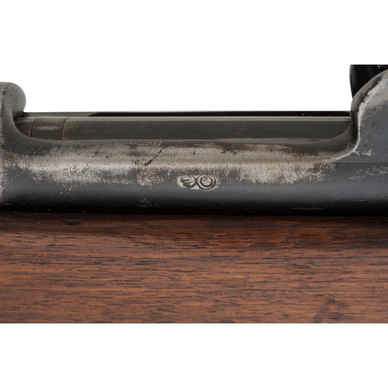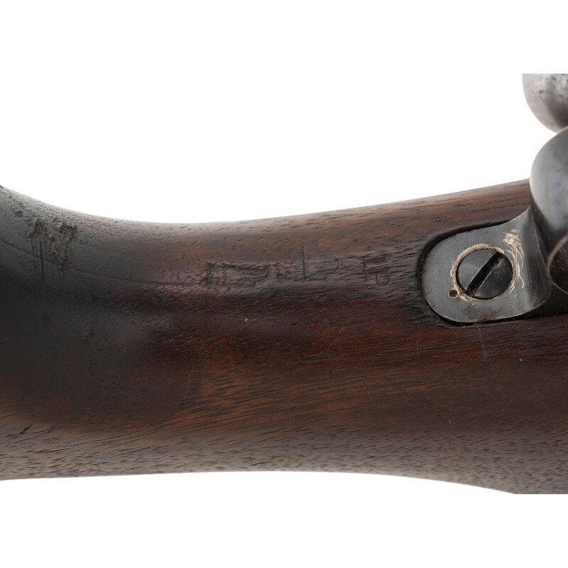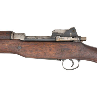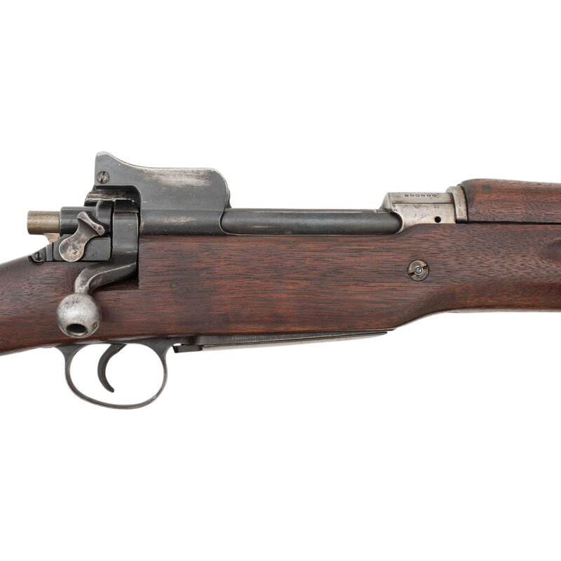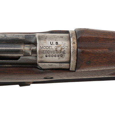 .30-06. 26" barrel length. SN: 660690. Parkerized metal finish with blued small parts mounting walnut semi pistol grip stock with full length upper handguard. Bolt action internal magazine fed rifle charged by stripper clips and utilizing a cock on close action. Sights consist of adjustable tangent rear and front blade with protectors. Receiver marked U.S./MODEL OF 1917/EDDYSTONE followed by serial number on top, with {Ordnance Bomb} on left side Wrist marked with 1 P followed by illegible markings. Barrel marked {Ordnance Bomb}/5-18. Item includes 1918-pattern leather sling. {C&R}