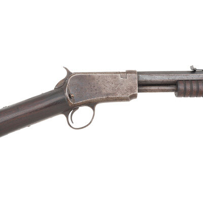 .22 W.R.F. 24" barrel length. SN: 368295. Gray brown patina overall with walnut furniture on a takedown frame featuring crescent butt, corncob frontend, and an octagonal barrel. Slide action repeating rifle fed by front loading tubular magazine mounting adjustable rear notch and front blade sights. Upper left barrel shows two-line maker's address and patent date. {C&R}