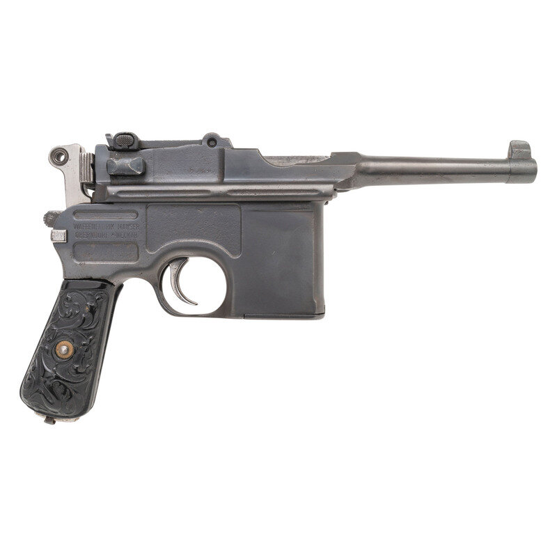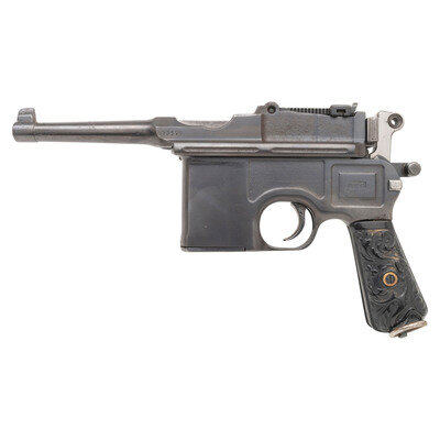 9mm Para. 4" barrel length. SN: 575491. Blued finish with straw colored and Nitre blued small parts mounting foliate pattern hardrubber grips with lanyard lop to butt. Short recoil operated single action autoloading pistol fed by an internal magazine charged with stripper clips. Left frame marked with MAUSER banner, and further showing WAFFENFABRIK MAUSER/OBERNDORF A. NECKAR to the right. Top of the barrel marked WAFFENFABRIK/MAUSER/OBERNDORF A/N. Serial numbers are mixed. Weak {Crown/U} commercial proof to upper left barrel flat nearly obliterated by refinishing. Frame is extensively pitted, as is the front sight. Lanyard loop to butt excessively thin, partly due to pitting. Grips do not match, and have been reshaped to fit with rough tool marks internally. {C&R}