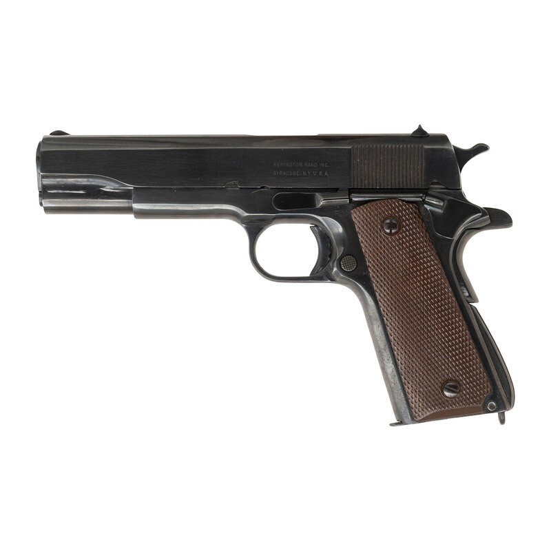 .45 ACP. 5" barrel length. SN: 1360773. Blued metal refinish overall mounting checkered Keyes fiber grips and military pattern sights. Short recoil operated single action autoloading pistol fed by detachable single stack magazines. Left slide struck in two lines REMINGTON RAND INC./SYRACUSE, N.Y. U.S.A. with the right frame marked UNITED STATES PROPERTY followed by M1911 A1 U.S. ARMY. Left frame shows the FJA inspector initials of Frank J. Atwood. Further marks include H initial to right triggerguard, P to left frame and upper slide, and 5 to left triggerguard. Comes with a SEARS marked Model 1917 leather 1911 holster with US embossed flap. Magazine is reblued to match the pistol and is unmarked. {C&R}