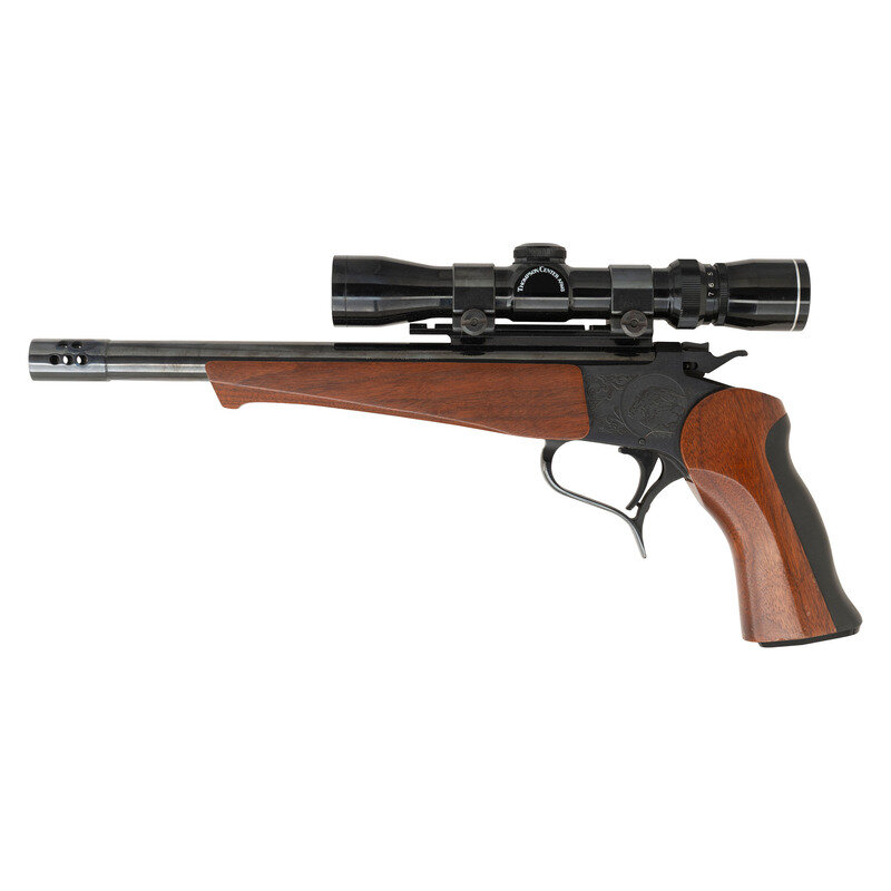 .30-30. 12.5" barrel length. SN: 374817. Blued finish with synthetic triggerguard mounting walnut grips and forend, rubber recoil pad to rear grip, and a ported muzzle. Single shot break-action pistol with hammer mounted safety lever, and a Weaver Rail to rear barrel. Standard make and model marks. Item uses a pair of Weaver Rings to mount a THOMPSON CENTER ARMS branded 2.5-7X scope. Comes with an unmarked Nylon holster and shoulder sling. {MODERN}