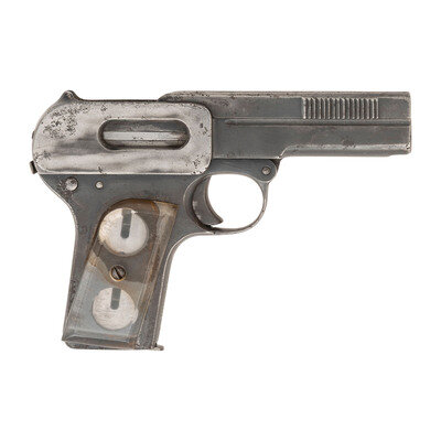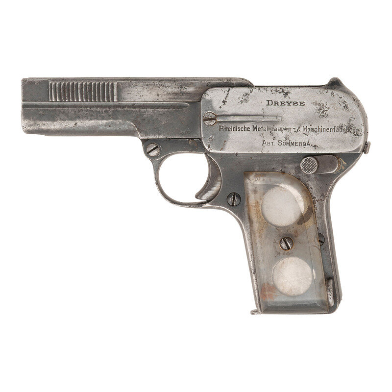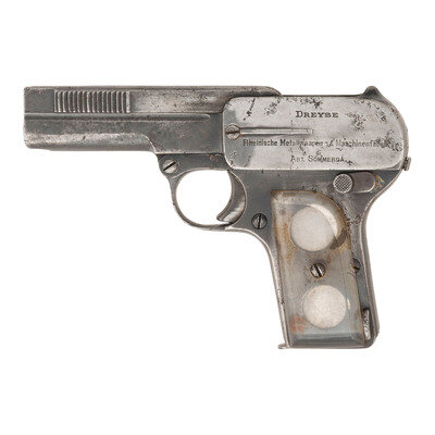 .32 ACP. 3.6" barrel length. SN: 192994. Blued metal finish with replaced clear synthetic grip mounting fixed front blade and rear notch sights. Simple blowback operated striker fired autoloading pistol fed by detachable single stack magazines. Left frame is marked DREYSE/Rheinische Metallwaaren & Maschinenfabrik/ABT. SOMERDA. Item shows the {Crown/N} proof o the left frame, and {Crown/Gothic Letter} stamp to the right. Forward gripstrap displays unit marking 455. R. 6. 34., indicating it was likely issued to the 455th Infantry Regiment's Company 6. Serial numbers match on the bolt, barrel, and frame. The magazine that comes with the handgun is not an original Dreyse magazine, and has had a latch cut into the rear strap, which fails to positively lock with the magazine latch. {C&R}