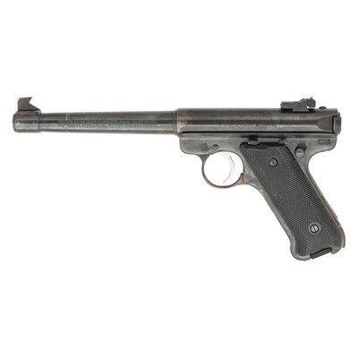.22 LR. 6.875" barrel length. SN: 19-95248. Blued finish with polished bolt and matte trigger mounting checkered black synthetic Ruger logo grips. Simple blowback operated single action autoloading pistol fed by detachable single stack magazines mounting adjustable rear notch and Patridge front blade sights. Standard make and model markings include two-line Warning and manual mark on left barrel, and model mark to left receiver. {MODERN}