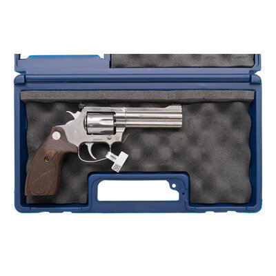 .357 Magnum. 4.25" barrel length. SN: RA258045. Polished stainless steel finish with matte hammer and trigger mounting matte black adjustable rear notch and red fiber optic front sights, and laminated wood Colt medallion grips. Double action six-shot hand ejector revolver featuring full length underlug, and matte finished solid barrel rib. Standard make and model markings. Comes in original Colt blue synthetic hard case with owner's manual and cable lock. {MODERN}