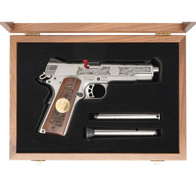 .45 ACP. 5" barrel length. SN: 671-89481. Bead blasted stainless steel finish with oxide finished small parts and machine engraved wood grips commemorating the Vietnam War. Single action short recoil operated revolver fed by detachable single stack magazines.Slide is machine engraved with American flags behind the cocking serrations, and the names and dates of notable Vietnam War battles in banners on both sides of the slide. Upper slide displays the POW-MIA flag over jungle foliage with the banner behind the chamber reading 128 OF 1000. Custom features include: triple white dot NOVAK'S sights, skeletonized Commander hammer, Memory Groove extended beavertail grip safety, flat checkered mainspring housing, extended safety lever, extended magazine release, beveled magazine well, and adjustable alloy trigger. Item comes with a wood presentation case and a total of two magazines, in addition to the original cardboard shipping box. {MODERN}