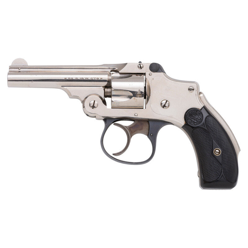 .32 S&W. 3" barrel length. SN: 177016. Nickel plated finish with blued small parts and casehardened hammer mounting Smith & Wesson monogram marked hardrubber grips. DAO top-break automatic ejector revolver with five-shot cylinder and pinned half-moon front blade and rear notch sights. Top of the barrel is struck with single line address reading SMITH & WESSON SPRINGFIELD MASS, U.S.A. with the left barrel caliber mark reading 32 S. & W. CTG between {Crosses}. Right frame with small monogram trademark. Left grip panel shows patent marking along the edge of the butt. {C&R}