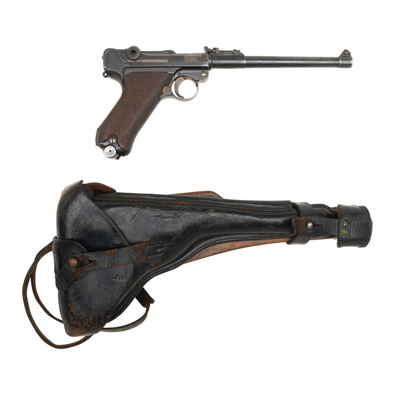 9mm Para. 7.9" barrel length. SN: 1464a. Blued metal finish with nitre blued and straw colored small parts mounting checkered walnut two-piece grips. Short recoil operated striker action toggle locked autoloading pistol fed by detachable single stack magazines. Item shows a commercial {Crown/N} mark to left barrel extension with date mark ground off of barrel extension. Item shows the Imperial German {Reichsadler} mark on the barrel and breechblock, with further scattered Gothic letter inspection marks. Lack of such marks on barrel extension suggests this part may have been replaced, or had them removed. Serial numbers mixed with nonfluted nonmatching firing pin. Item comes with a WWII vintage aluminum base plug magazine. Combination shoulder-board and holster struck with a worn down {Crown/Gothic S}, and the socket serial number mark reading 1464a, matching the pistol. Inner flap of the holster stamped with the maker marking F. Fischer/RGP/1915. Further accessories include a Waffenamt marked WWII vintage disassembly tool, and a nickel plated cleaning rod. {C&R}